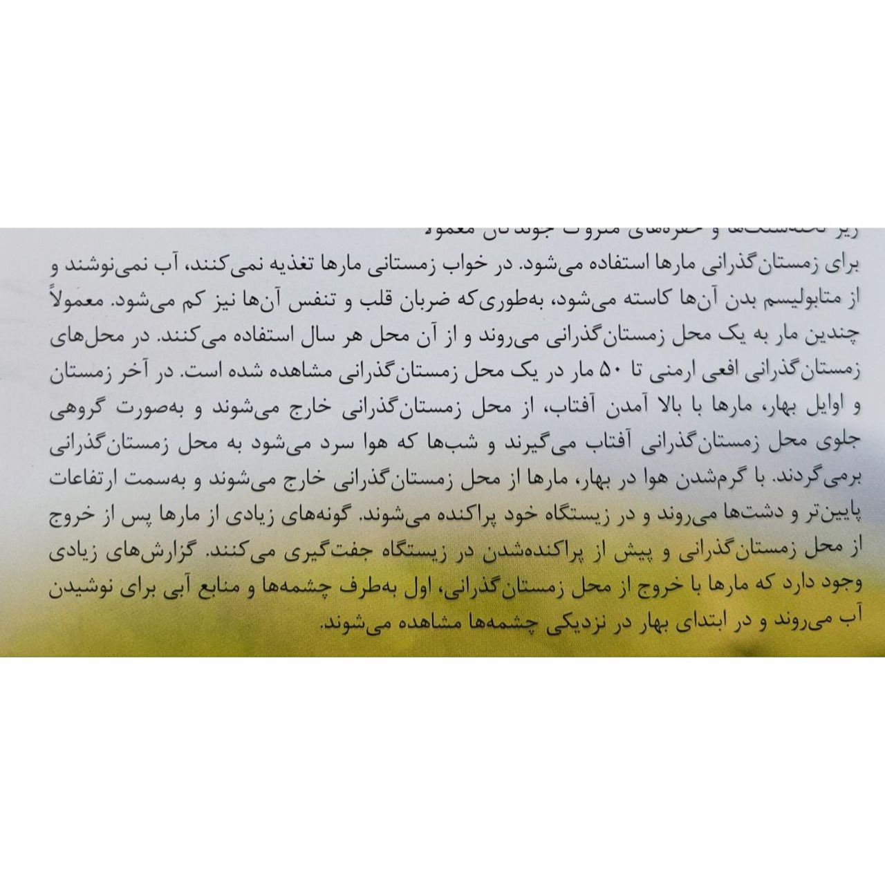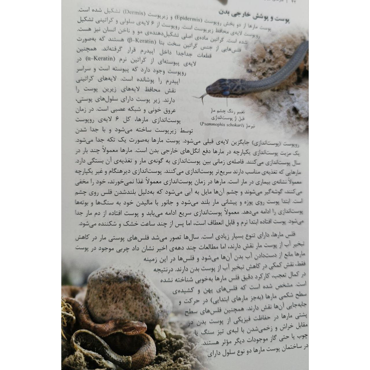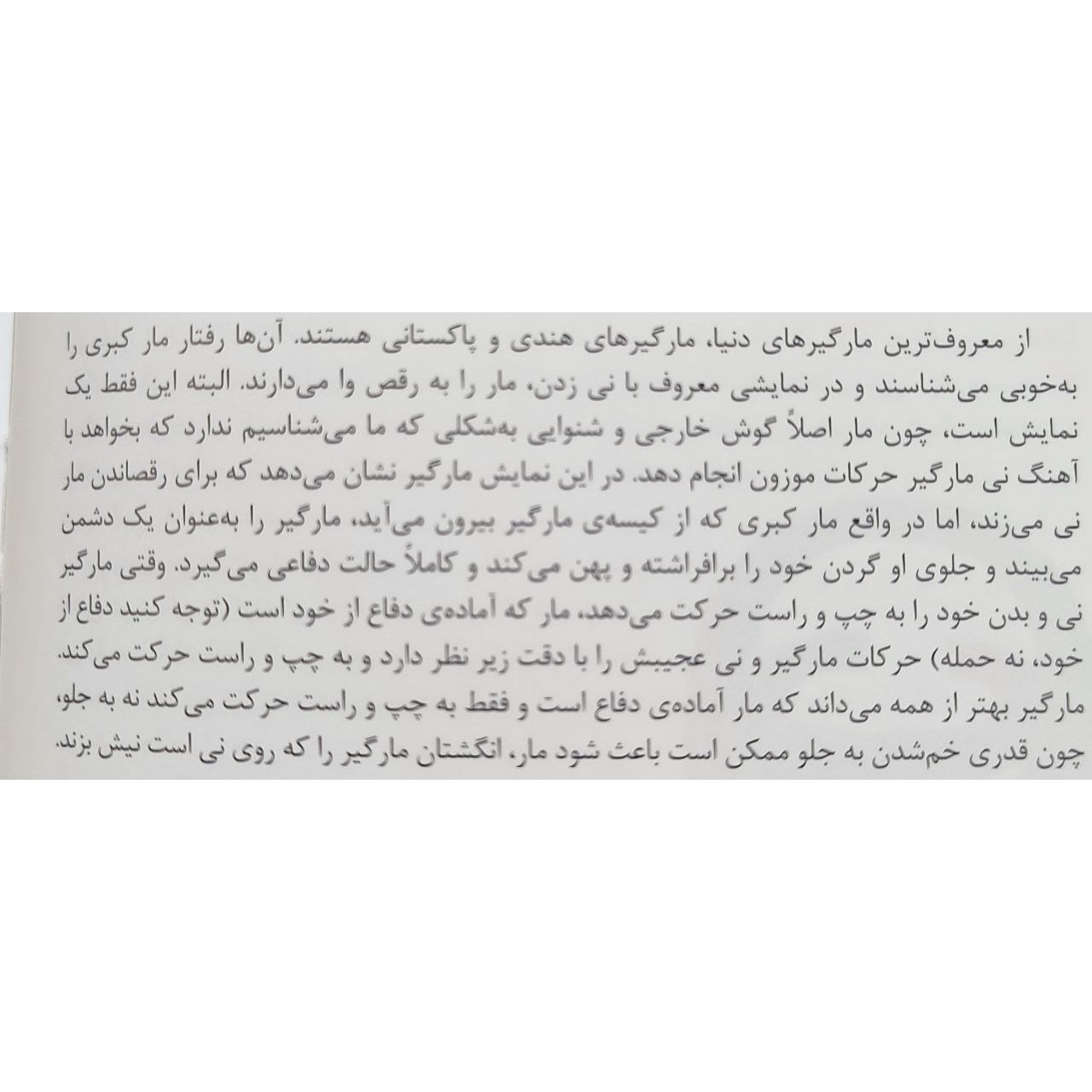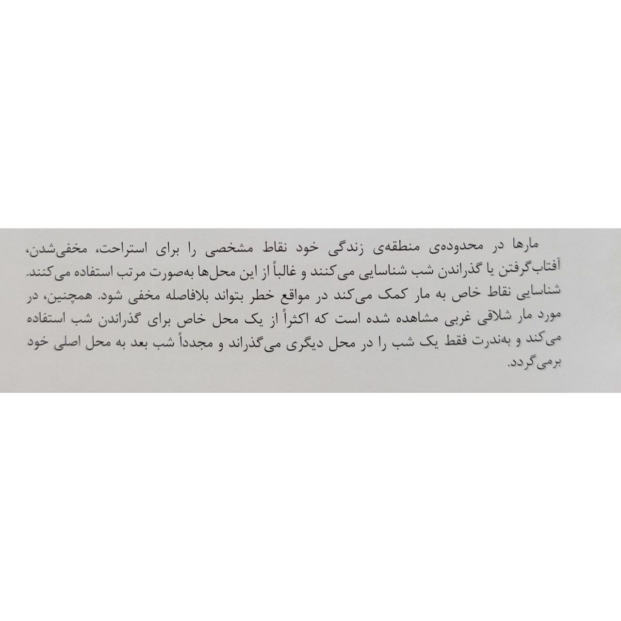 بخش اول کتاب توضیحات کلی در مورد مارها و اهمیت آنها در اکوسیستم ارائه میدهد که برای افرادی که علاقهمند به حیات وحش و بهویژه خزندگان هستند، بسیار مفید است. بخش دوم کتاب به معرفی گونههای مختلف مارهای ایران میپردازد که با تصاویر با کیفیت و توضیحات جامع همراه است. این بخش برای شناسایی و آشنایی با مارهای بومی ایران بسیار کاربردی است.