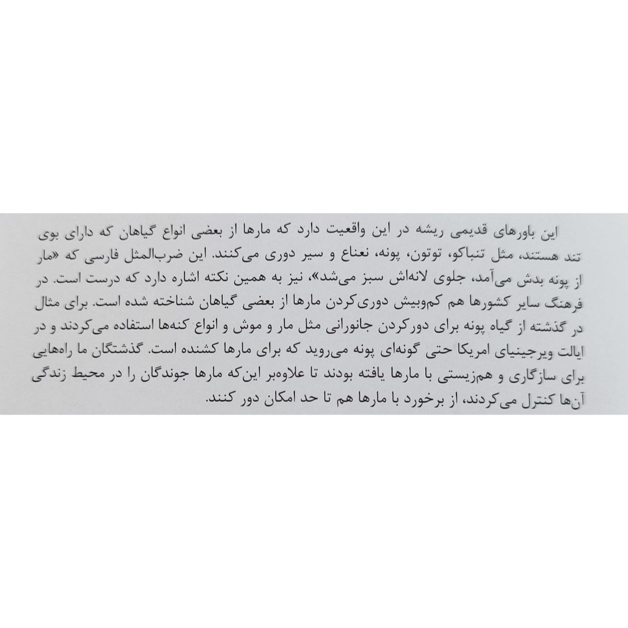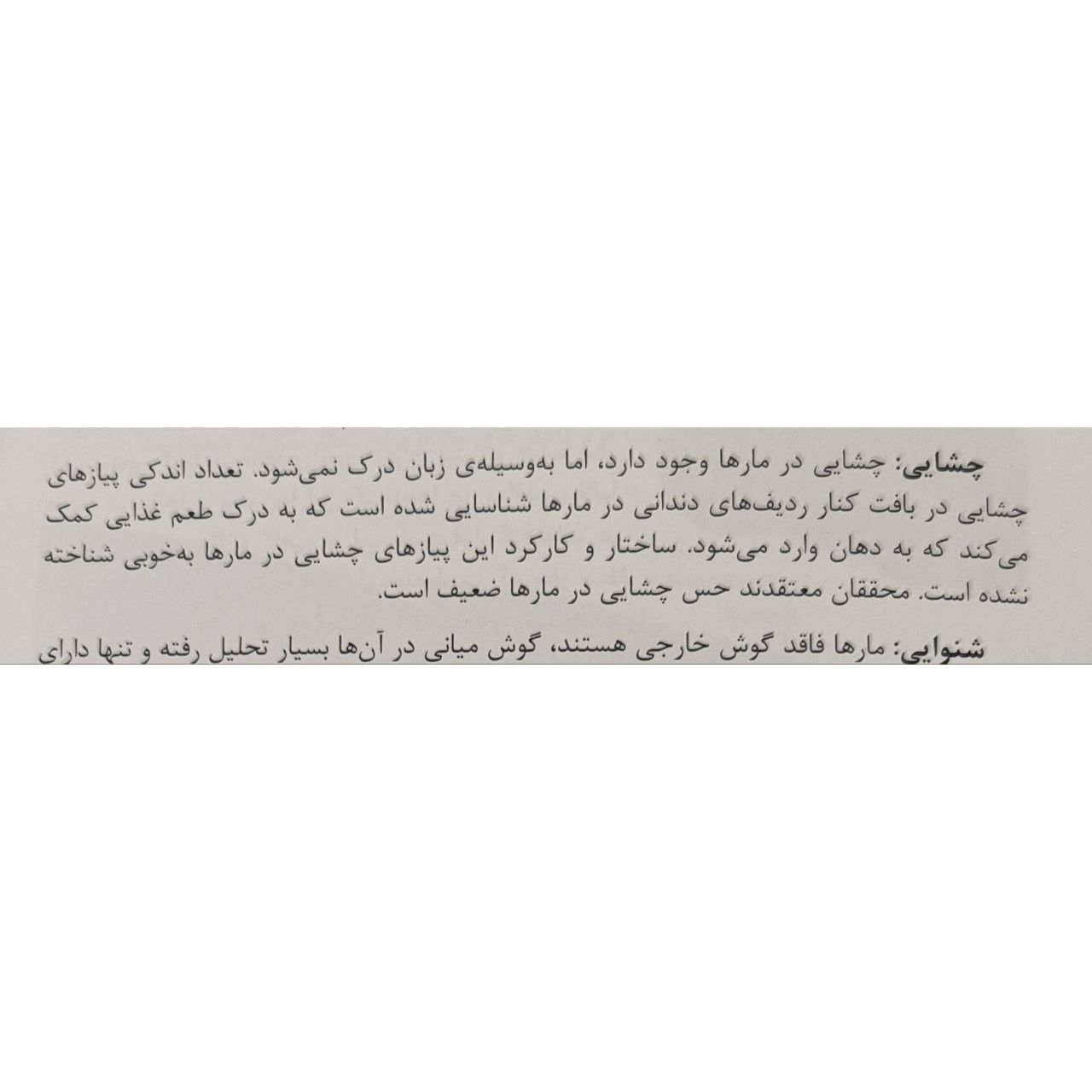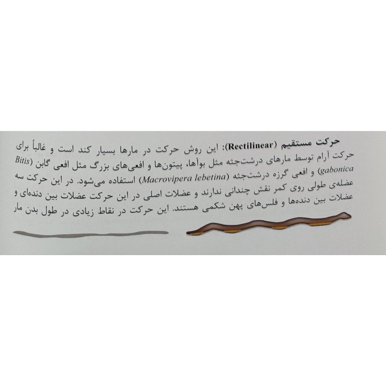 بخش اول کتاب توضیحات کلی در مورد مارها و اهمیت آنها در اکوسیستم ارائه میدهد که برای افرادی که علاقهمند به حیات وحش و بهویژه خزندگان هستند، بسیار مفید است. بخش دوم کتاب به معرفی گونههای مختلف مارهای ایران میپردازد که با تصاویر با کیفیت و توضیحات جامع همراه است. این بخش برای شناسایی و آشنایی با مارهای بومی ایران بسیار کاربردی است.